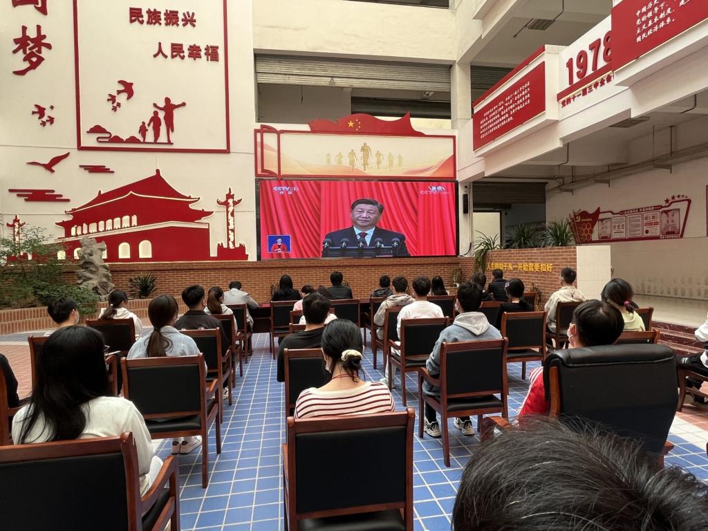 学院党总支高度重视此次收听收看活动,结合当前疫情防控实际,提前谋划部署,统筹安排师生集中观看和就近就地收看。广大师生聚精会神聆听习近平总书记的工作报告,共同见证这一重要历史时刻,感受团结奋进的时代脉搏,许多党员同志不时记录报告精彩内容,会场响起阵阵掌声。