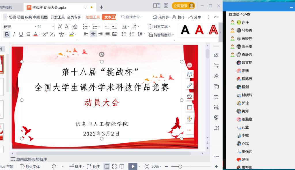 为深入贯彻党的二十大精神,深入实施科教兴国战略、人才强国战略、创新驱动发展战略,培养学生创新精神和实践能力。2023年3月2日晚,信息与人工智能学院召开“第十八届‘挑战杯’课外学术科技作品竞赛”动员大会。会议通过线上方式进行,学院全体教职工参会。