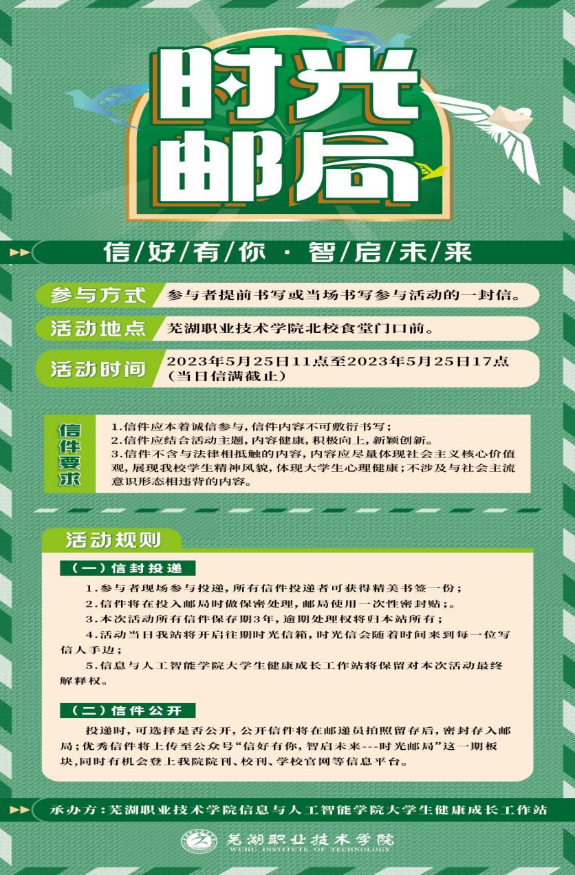 为提高大学生心理健康教育质量,帮助学生疏导困惑、释放压力,营造健康向上的学习氛围,5月25日上午,信息与人工智能学院以“心沐阳光,青春绽放”为主题,举办“信好有你,智启未来”时光邮局心理健康教育活动。