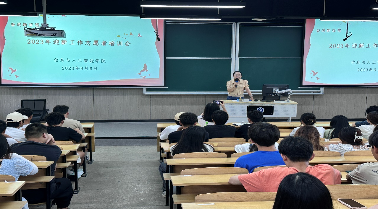 信息赋能,智创未来。为扎实做好迎新工作,确保工作平稳有序开展,信息与人工智能学院于2023年9月6日开展了迎新工作志愿者培训会。会议由学院组织员查静芳、学院团委书记晋文艳主讲,参会人员为信息与人工智能学院全体迎新志愿者以及2023级新生辅导员荆英杰。