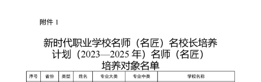 新时代职业学校名师(名匠)名校长培养计划由教育部自2023年开始组织实施,每年压茬推进,旨在培养打造一批理想信念坚定、师德高尚、教育教学能力和专业实践能力突出的双师型名师(名匠),一批办学理念先进、办学定位准确、勇于开拓创新、精通现代职业学校治理的教育家型名校长。此次,经各省级教育行政部门推荐和专家综合评议,教育部共确定高等职业院校名师(名匠)培养对象210人、中等职业学校名校长培养对象 50人。