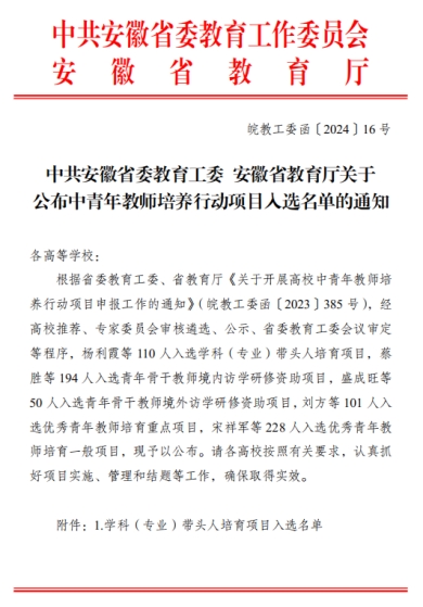 安徽省学科(专业)带头人培育项目是大力实施人才强省战略、培养造就高层次人才队伍的重要举措,旨在充分发挥高层次人才在学科建设、专业研究中的领军和带头作用,为打造“三地一区”、建设“七个强省”提供强有力的人才智力支撑。