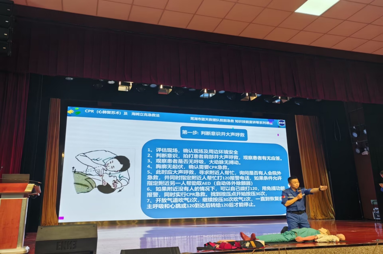 讲座在热烈的气氛中拉开帷幕。芜湖市蓝天救援队的资深讲师运用丰富的实战经验和专业的救援技能,将复杂的安全知识转化为简洁明了的语言,为在场的师生带来了一场生动的急救知识盛宴。
