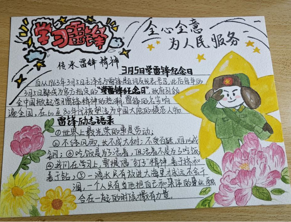 本次活动鼓励学生通过手抄报的形式诠释新时代雷锋精神。学生们利用课余时间搜寻雷锋事迹,摘录经典语录,绘制主题插画,将雷锋的感人故事与自身的感悟融入作品当中。一幅幅色彩鲜艳,图文并茂的作品,展现了雷锋“钉子精神”“为人民服务”的深刻内涵,也体现了信息与人工智能学院学子们对雷锋精神的理解与传承。
