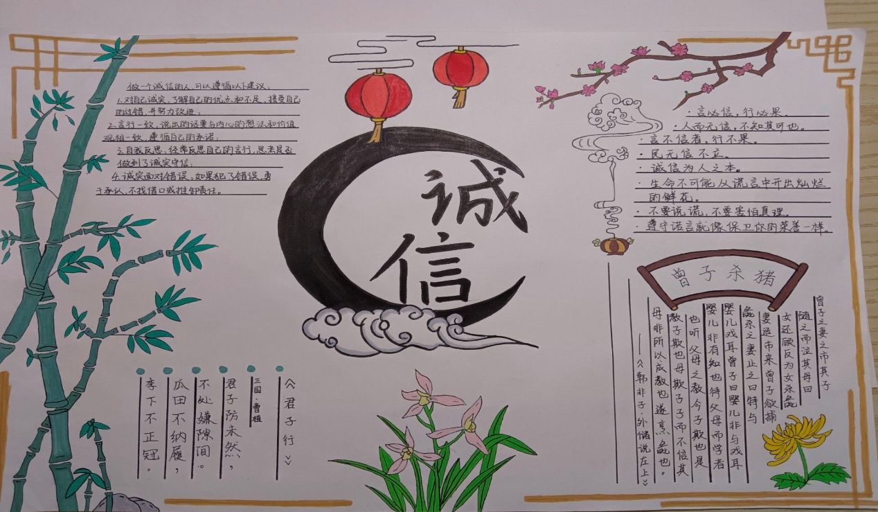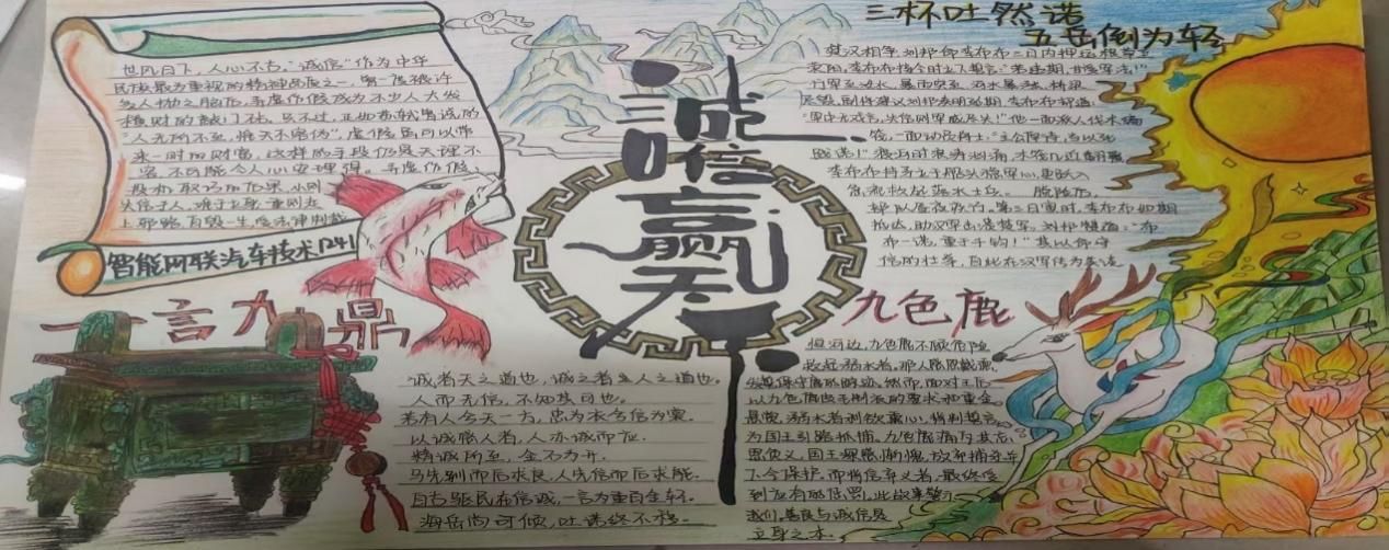 为进一步深化同学们的诚信意识,学院特别策划了“诚信手抄报制作”特色活动。这一活动激发了同学们的无限创意与热情,他们纷纷挥毫泼墨,用精美的图画、生动的文字,创作出一幅幅主题鲜明、内容深刻的手抄报作品。这些作品不仅展现了同学们对诚信的深刻理解与独特感悟,更成为校园里一道道亮丽的风景线,传递着诚信的正能量。