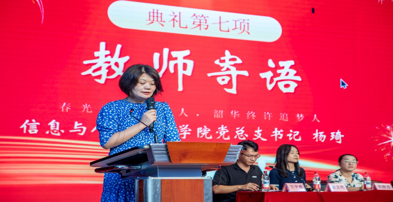 典礼临近结束,信息与人工智能学院党总支书记杨琦带来教师寄语。她从教育者的角度,叮嘱同学们珍惜大学时光,既要扎实掌握专业技能,也要培养良好的品德修养,在成长道路上学会感恩、勇于担当,努力成为有理想、有本领、有担当的时代新人。
