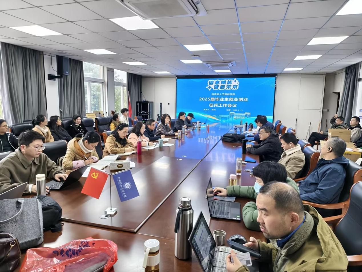 为扎实推进2025届毕业生就业创业征兵工作,信息与人工智能学院于3月13日下午在信实楼208会议室召开2025届就业创业征兵工作推进会议。学院全体教职工参加会议,会议由党总支副书记杨琦主持。