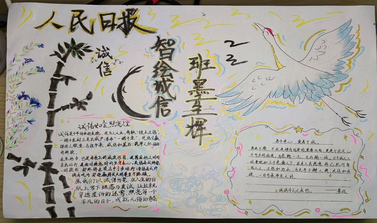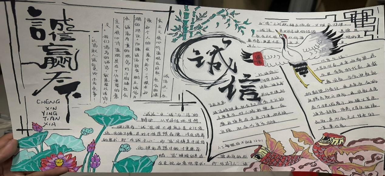 为进一步深化同学们的诚信意识,学院特别策划了“诚信手抄报制作”特色活动。这一活动激发了同学们的无限创意与热情,他们纷纷挥毫泼墨,用精美的图画、生动的文字,创作出一幅幅主题鲜明、内容深刻的手抄报作品。这些作品不仅展现了同学们对诚信的深刻理解与独特感悟,更成为校园里一道道亮丽的风景线,传递着诚信的正能量。