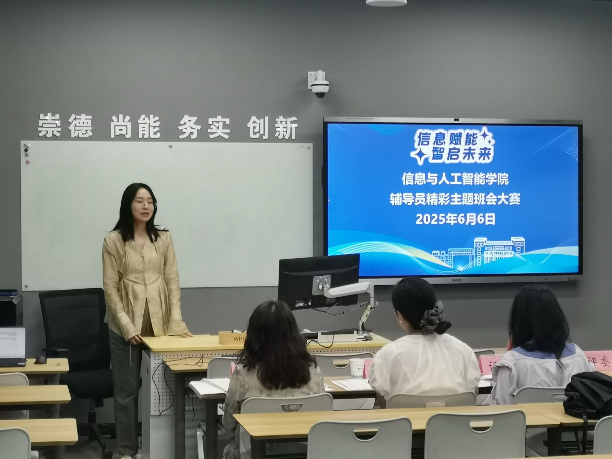 为提升辅导员主题班会设计能力,加强学生思想政治教育工作的实效性,6月6日下午,信息与人工智能学院在教学楼102教室举办辅导员精彩主题班会大赛。大赛邀请学生处易班发展中心主任周静雯、人文旅游学院学工科长沈启亮、汽车与航空学院学工科长王茜及学院党总支副书记查静芳担任评委,组织员晋文艳主持,学院全体专兼职辅导员参加比赛。